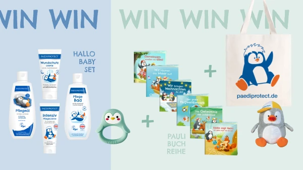Das Set enthält: PAEDIPROTECT Wundschutzcreme , PAEDIPROTECT Pflegebad, Pflegeöl, PAEDIPROTECT Intensiv Pflegecreme, PAEDIPROTECT Pinguin Beißring