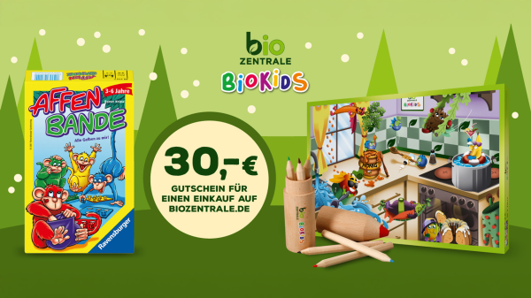 du gewinnst einen 30-Euro-Wertgutschein für den Bio-Zentrale Online-Shop, ein BioKids Puzzle, BioKids Buntstifte und das Spiel